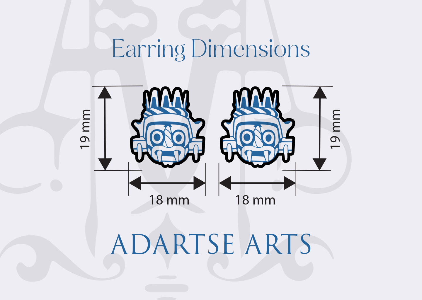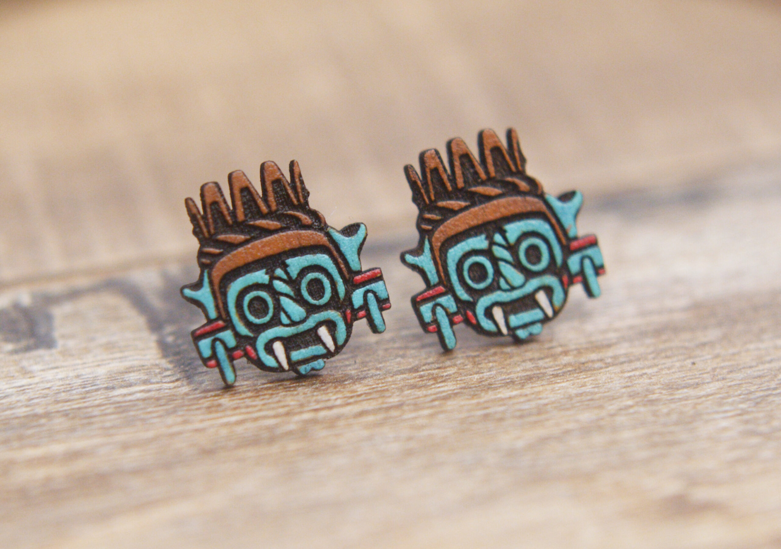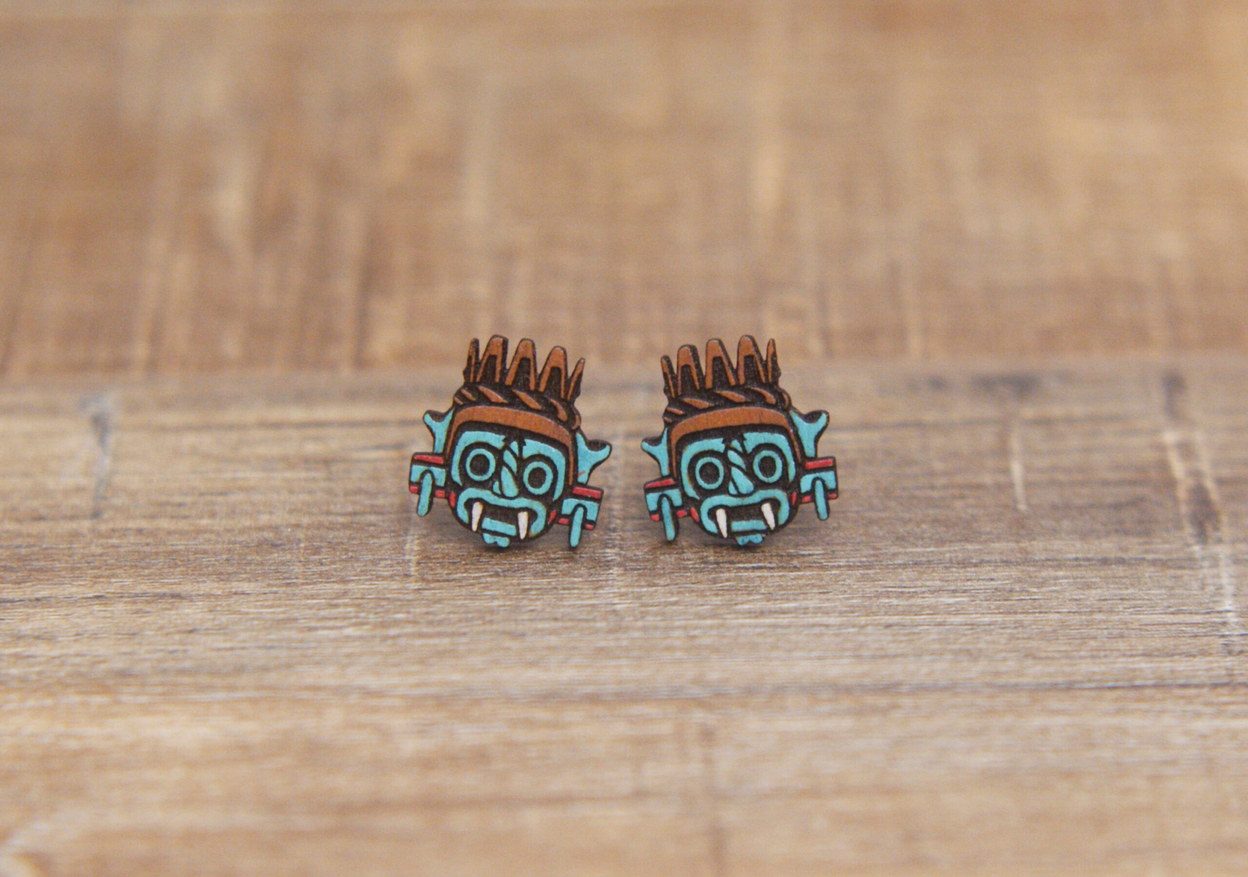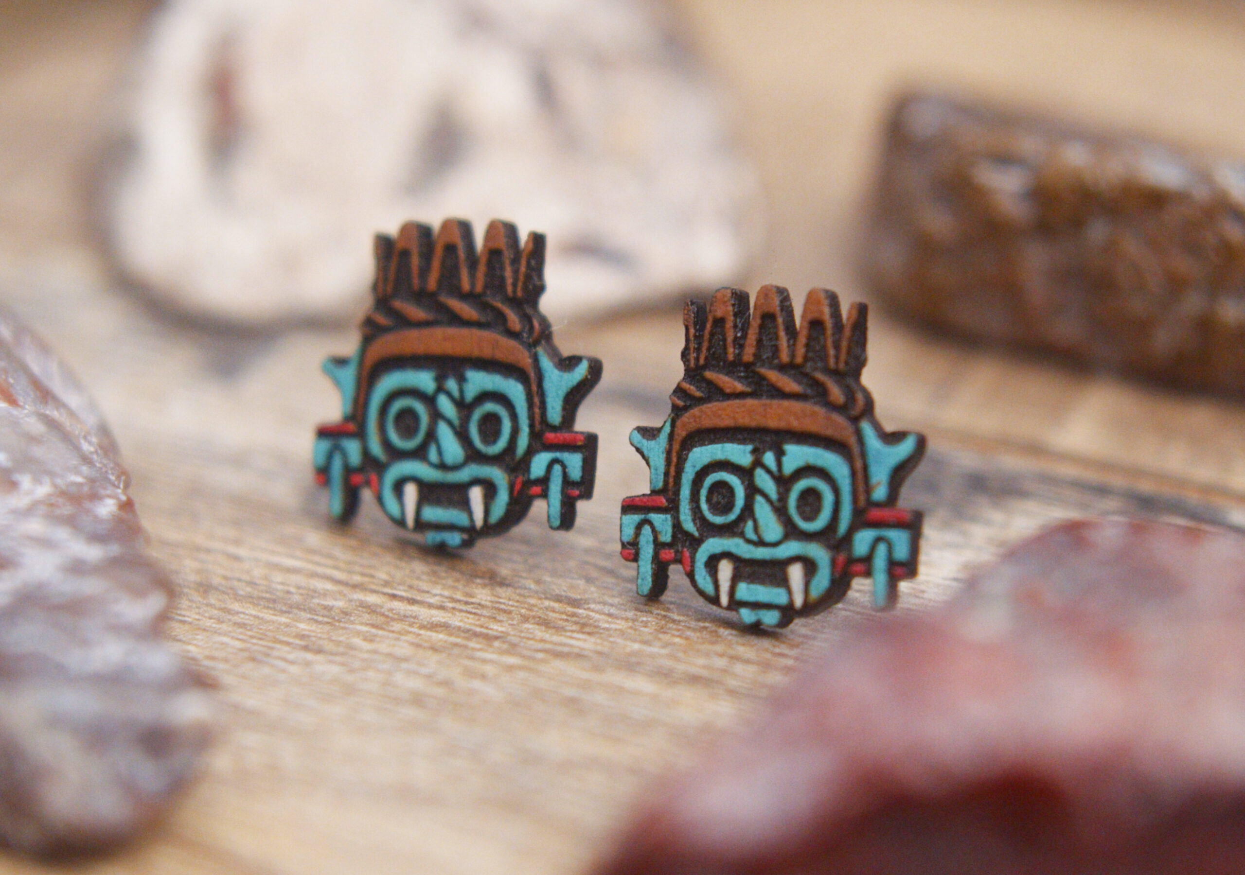Tlaloc wooden stud earrings, Aztec Mayan Jewelry. This exquisite set is laser cut and hand painted with hypoallergenic metal studs for your confort. The design represents the Tlaloc Aztec god of rain and earthly fertility.